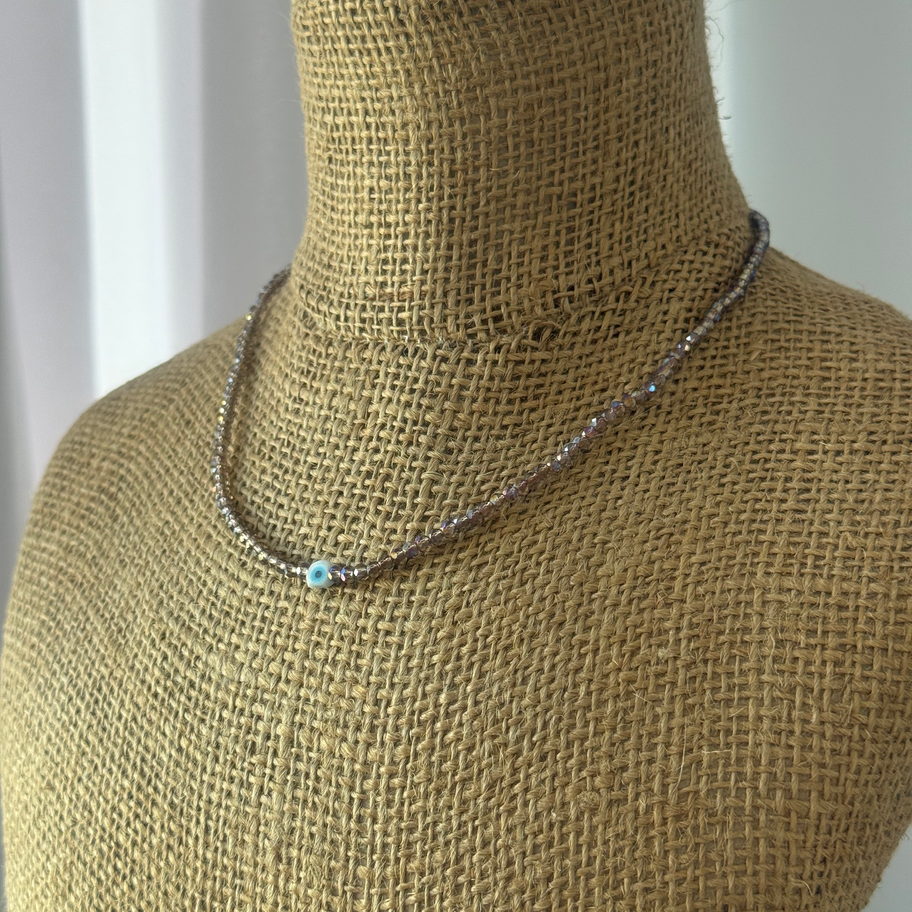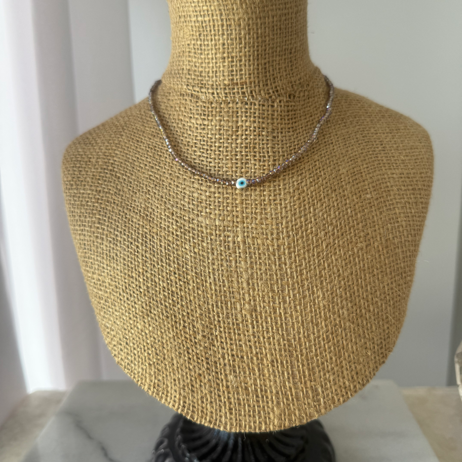 Collar confeccionado en hilo chino, con cuentas en cristal de roca facetadas 3mm. Dije de murano tercer ojito.