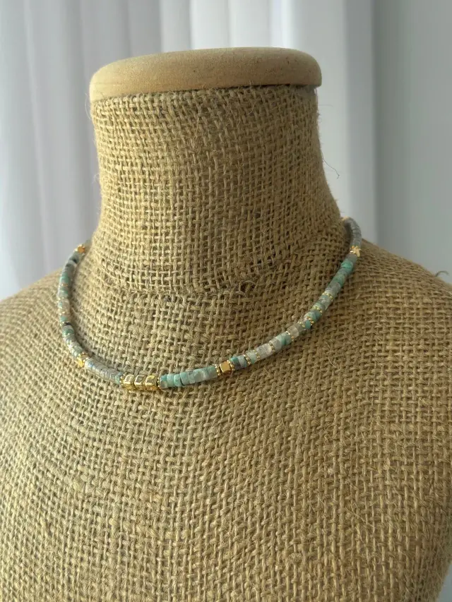 Collar flexible, realizado con piedras naturales arandela de 3mm+ cuentas y terminaciones de oro laminado